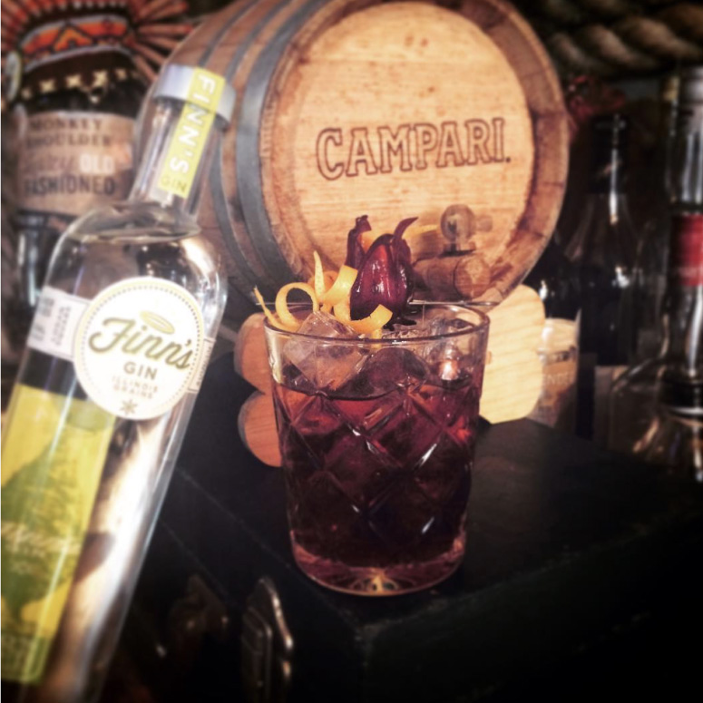 • Finn’s Chicago Gin • Barrel Aged Campari & Cinzano 1757 • Hibiscus Flower & Orange Ribbon •
